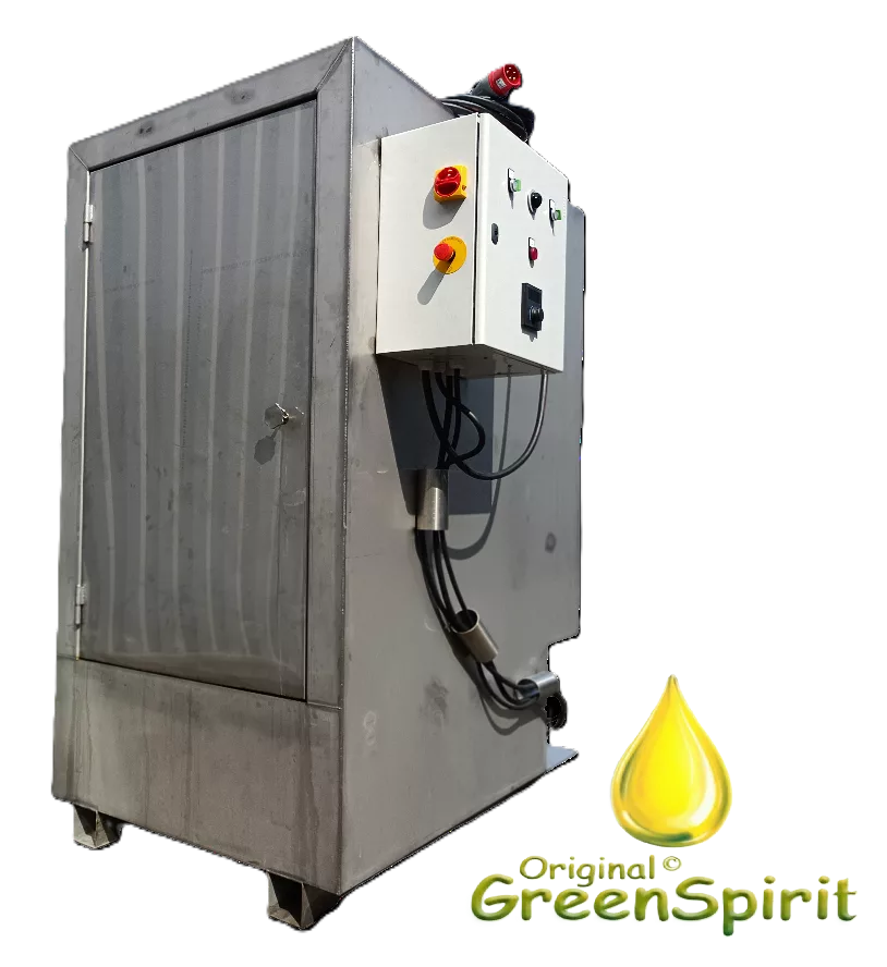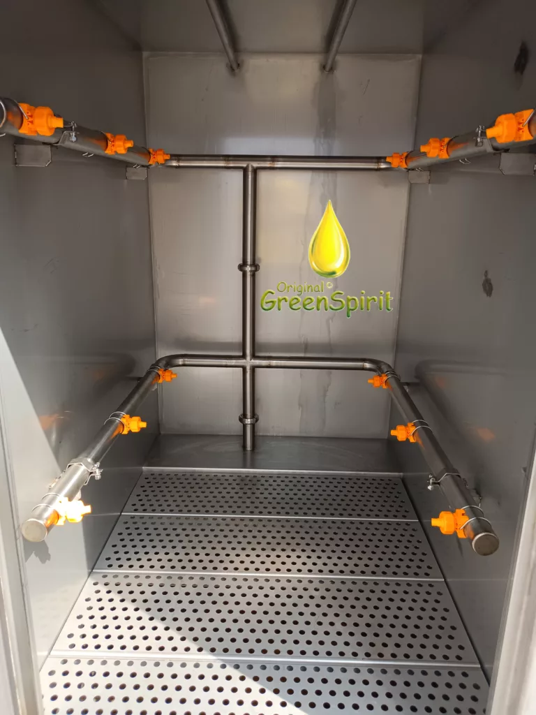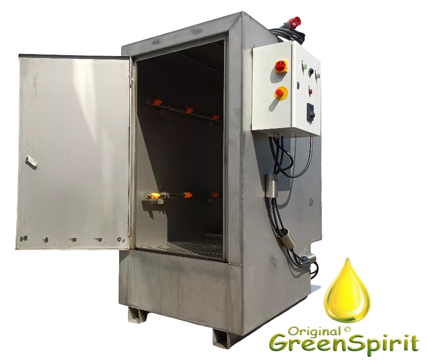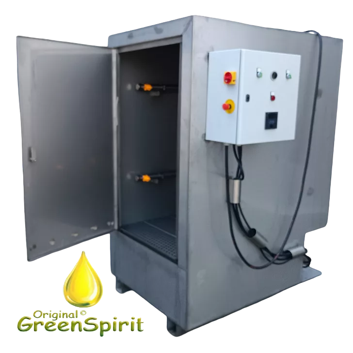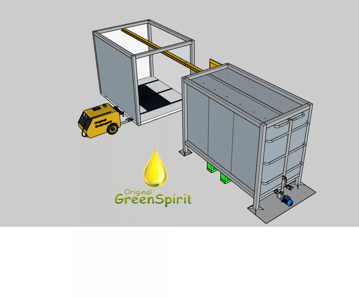 Pour le premier remplissage de la cabine, il suffit de trois jerrycans de produit consommable décapant OriginalGreenSpirit et de cent vingt litres d’eau courante (120l). Un stock de trois jerrycans supplémentaires est utile pour ne pas être à court et poursuivre son activité sereinement.